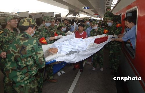 2008年5月19日,按照鐵道部的統(tǒng)一部署,成都鐵路局開行首趟運(yùn)送地震災(zāi)區(qū)受傷群眾專列,19日1O:20從綿陽發(fā)車,當(dāng)日16:57到達(dá)重慶北站。運(yùn)送了206名地震受傷群眾及家屬前往重慶接受治療。該次專列專列車次為57005/6/5次路用傷員列車,編組19輛,全部為25G空調(diào)硬臥車。其中硬臥15輛并配備餐車及行李車!