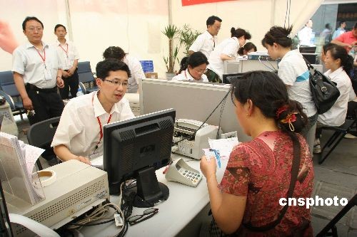 圖為工作人員為客戶提供服務(wù)。中國工商銀行都江堰支行是災區(qū)災后第一家全面開展金融業(yè)務(wù)的銀行。