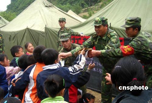 5月20日,四川省平武縣南壩鎮(zhèn)埡頭坪村,解放軍某裝甲師炮兵團在這里建立的“托起明天的太陽”災(zāi)區(qū)戰(zhàn)地小學正式開課。 中新社發(fā) 汪景磊 攝