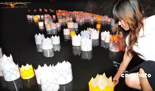 5月20日,全國哀悼日第二天,河南省洛陽市龍門石窟職工以及學生志愿者到盧舍那大佛前的伊河上放800余盞河燈,他們通過傳統(tǒng)的放河燈形式對四川地震遇難者寄予哀思。