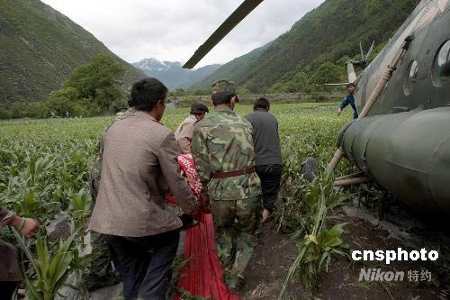 圖為解放軍官兵把重傷孕婦送上直升飛機(jī)。中新社發(fā) 譚超 攝