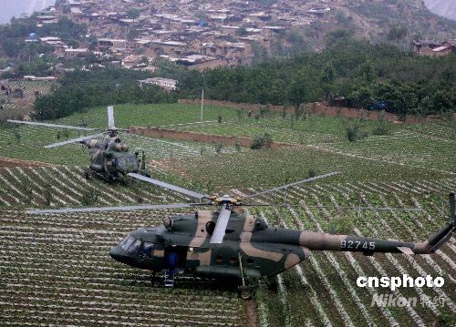 成都軍區(qū)陸航團(tuán)空降救兵到受災(zāi)嚴(yán)重的高山羌寨,建立救災(zāi)基地。中新社發(fā) 賈國(guó)榮 攝