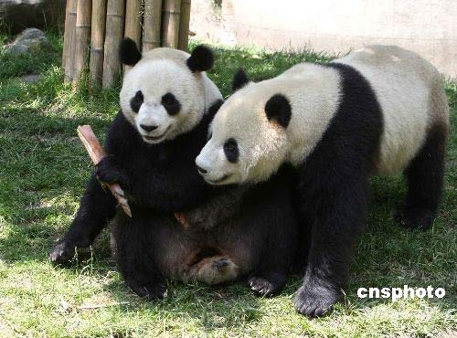 5月23日,準(zhǔn)備贈(zèng)送給臺(tái)灣的大熊貓團(tuán)團(tuán)和圓圓,在四川汶川大地震后的臥龍大熊貓保護(hù)區(qū)內(nèi)無憂無慮地戲耍。中新社發(fā) 任晨鳴 攝
