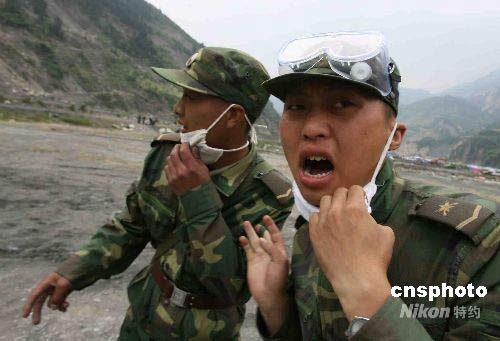5月21日,又一次余震來襲,參加救援的解放軍士兵呼喊人們緊急避險。中新社發(fā) 曾憲平 攝