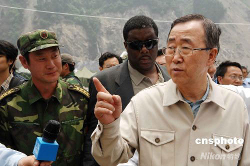 5月24日,聯(lián)合國秘書長潘基文乘直升機抵達四川汶川映秀鎮(zhèn)察看災情。中新社發(fā) 趙振清 攝