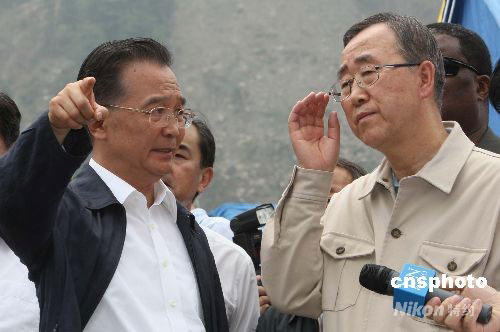 溫家寶與聯(lián)合國秘書長潘基文在映秀會面