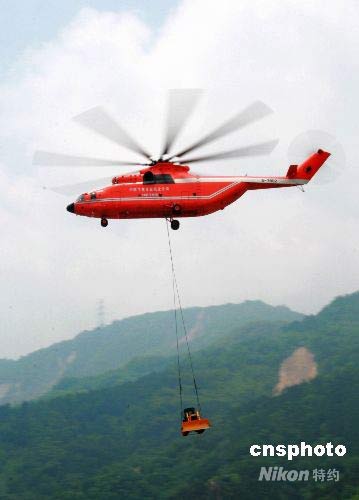 5月26日,一架號(hào)稱“空中巨無霸”的米-26重型運(yùn)輸直升機(jī)在四川綿陽任家坪吊運(yùn)鏟車、挖機(jī)等工程機(jī)械到唐家山堰塞湖。另悉,位于北川縣城上游的唐家山堰塞湖是目前汶川大地震形成的最大的堰塞湖,也是目前四川震區(qū)已發(fā)現(xiàn)的三十四處堰塞湖中體量最大、最險(xiǎn)的一處。中新社發(fā) 陳地長 攝