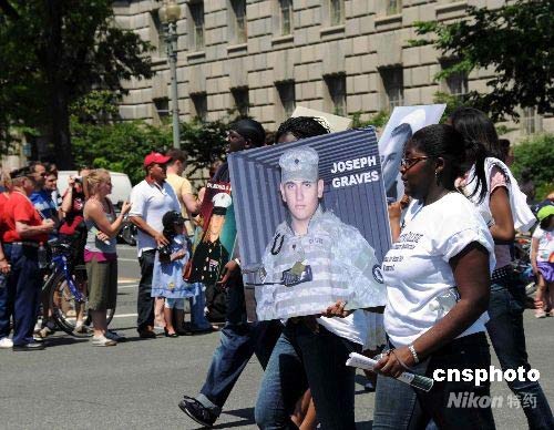 一些反戰(zhàn)組織也舉行了反戰(zhàn)示威,他們高舉在伊拉克戰(zhàn)場(chǎng)上陣亡的士兵畫(huà)像,要求布什政府盡快撤軍。中新社發(fā) 邱江波 攝