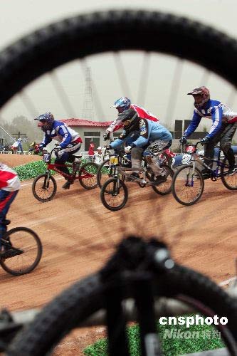 2008國際自行車聯(lián)盟BMX(小輪車)世界錦標(biāo)賽將于5月28日晚在山西省太原市拉開戰(zhàn)幕。33個(gè)國家的870多名運(yùn)動(dòng)員參加此次比賽。5月27日上午,先期到達(dá)的國外運(yùn)動(dòng)員抓緊時(shí)機(jī),熟悉場(chǎng)地。中新社發(fā) 張?jiān)?攝