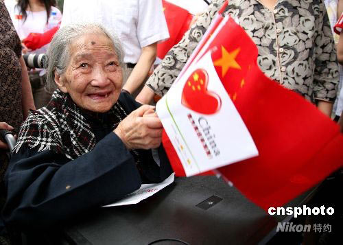 5月27日,奧運(yùn)會(huì)圣火在江蘇南京傳遞,112歲的胡家芝老人在家人的陪伴下,來到火炬?zhèn)鬟f現(xiàn)場南京市北京西路,與周圍的群眾一道為火炬?zhèn)鬟f加油。 中新社發(fā) 鐘山 攝