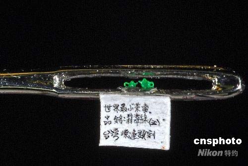 5月28日,臺灣著名微雕藝術(shù)家陳逢顯展示其微雕新作——“世界最小茶壺”。圖中的茶壺系用翡翠綠顏色寶石的粉末,雕刻出供藝術(shù)觀賞的茶壺。比針孔還要小得多,需透過高倍顯微鏡才能觀賞。陳逢顯“世界最小茶壺系列”的部分作品,現(xiàn)正在坪林茶葉博物館展出。中新社發(fā) 陳立宇 攝