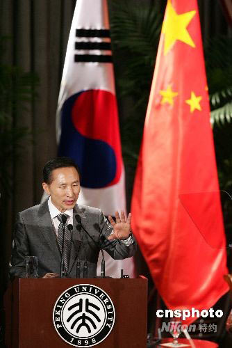 圖:韓國(guó)總統(tǒng)李明博在北京大學(xué)演講