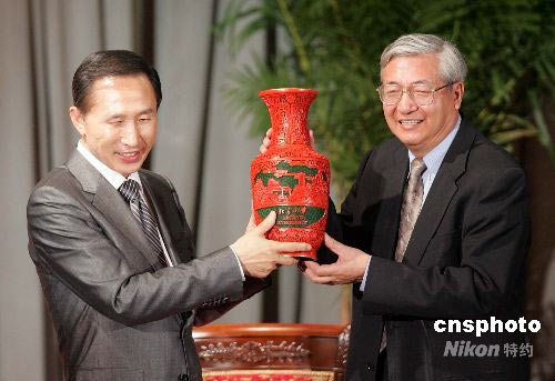 圖為北京大學(xué)校長許智宏(右)向李明博贈送禮物。中新社發(fā) 張宇 攝