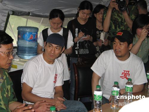 5月29日下午3時(shí)許,劉德華、張國(guó)立、鄭秀文、葛優(yōu)、馮小剛、陳道明等人來(lái)到收治了3000余名地震傷員的成都軍區(qū)總醫(yī)院進(jìn)行慰問(wèn)。其間,劉德華、張國(guó)立、陳道明等人分別發(fā)言。一句句鼓勵(lì)的話語(yǔ),一聲聲親切的問(wèn)候,給傷員和醫(yī)護(hù)人員帶來(lái)了快樂(lè)和勇氣。據(jù)了解,這是“5.12關(guān)愛(ài)行動(dòng)”的第二站, 此次活動(dòng)由劉德華和張國(guó)立等人發(fā)起。中新社發(fā) 朱琥姚遠(yuǎn) 攝