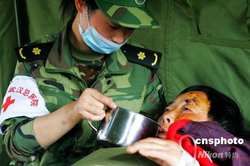 廣州軍區(qū)武漢總醫(yī)院護士彭葉葉,在汶川為從廢墟中救出來的劉華書老人喂藥。中新社發(fā) 徐維鴻 攝