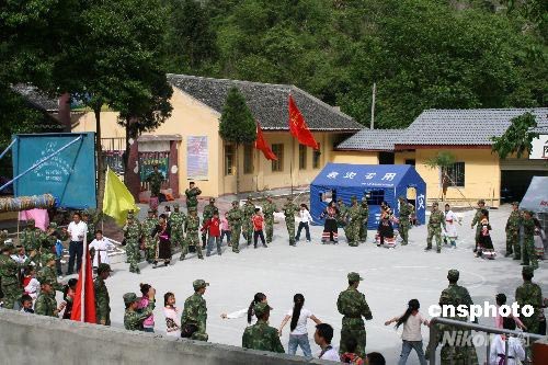 5月29日,“六一”兒童節(jié)前夕,四川省平武縣木座藏族鄉(xiāng)中心小學(xué)學(xué)生和駐扎在木座藏族鄉(xiāng)的濟(jì)南軍區(qū)某紅軍團(tuán)官兵一起聯(lián)歡。5月16日,這個紅軍團(tuán)從湖北省孝感縣千里機(jī)動來到這里,官兵們顧不上休息就展開救援工作。木座藏族鄉(xiāng)的十幾個村小組,分布在700多平方公里的山谷大川中,官兵們分成30多個搜救小分隊(duì),深入到各個山溝村寨營救幸存者、拆除危房、搭建帳篷小學(xué)、設(shè)立救助站,使1700多人有了溫馨的家。圖為紅軍團(tuán)官兵與木座藏族鄉(xiāng)中心小學(xué)師生跳起 “團(tuán)結(jié)舞”。中新社發(fā) 虞平 攝