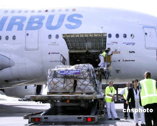 巴黎時(shí)間5月30日下午,由中國(guó)駐法國(guó)大使館組織的第二批救災(zāi)帳篷從巴黎戴高樂(lè)機(jī)場(chǎng)啟運(yùn)四川地震災(zāi)區(qū),這批帳篷共1105頂,價(jià)值25萬(wàn)多歐元。帳篷的募集得到了法國(guó)僑界、法國(guó)企業(yè)界的大力支持,由空客提供巨無(wú)霸A380飛機(jī)運(yùn)送。另外,中國(guó)駐法使館和僑界組織的第三批救災(zāi)帳篷1000頂將于30日夜里啟運(yùn)四川。中新社發(fā) 吳衛(wèi)中 攝