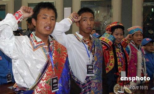 圖為4名藏族小營員與大家一起對著營旗宣誓。