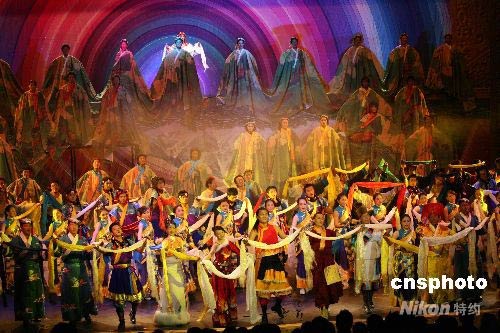 5月31日晚,西藏自治區(qū)文藝界舉行《幸福在路上》主題匯演,此系四川大地震后西藏首場大型演出,雪域兒女以吉祥哈達(dá)祝福祖國、祝福四川、祝福北京奧運(yùn)會。中新社發(fā) 賈長飛 攝