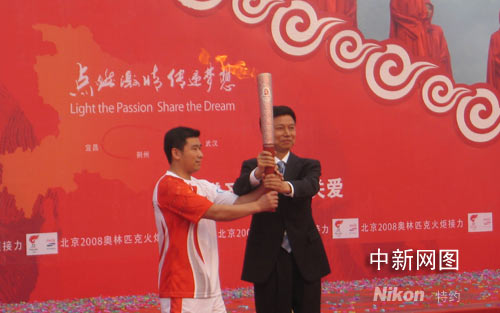 六月二日上午八時十二分,北京奧運(yùn)會火炬接力荊州傳遞開始,該市傳遞路線全長為十八點(diǎn)八公里。圖為體操奧運(yùn)冠軍鄭李輝從中共荊州市委書記應(yīng)代明手中接過火炬開始第一棒傳遞。 中新社發(fā) 艾啟平 攝