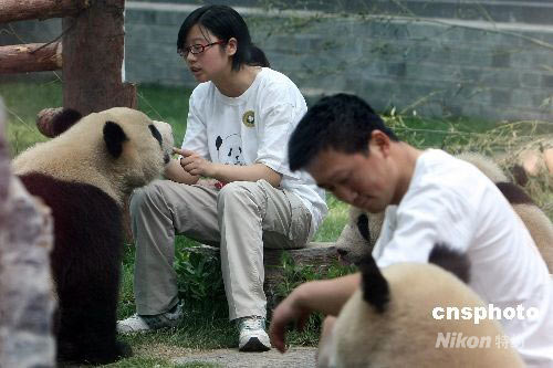 6月5日上午,八只臥龍“奧運大熊貓寶寶”在北京動物園的新家中首次公開亮相。這些1歲多的“小國寶”不時需要臥龍來的飼養(yǎng)員用四川鄉(xiāng)音安撫它們在5·12大地震中受到驚嚇的心靈。 中新社發(fā) 任晨鳴 攝
