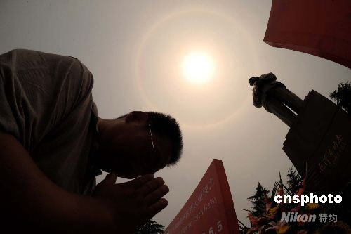 6月5日,奧運(yùn)圣火湘潭、韶山傳遞結(jié)束儀式在毛澤東銅像廣場(chǎng)舉行,儀式結(jié)束后現(xiàn)場(chǎng)出現(xiàn)日暈奇觀。中新社發(fā) 廖攀 攝