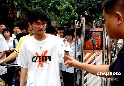 參加首日高考的福州考生步入福州銅盤中學(xué)考點時,主動出示準(zhǔn)考證和身份證。中新社發(fā) 劉可耕 攝