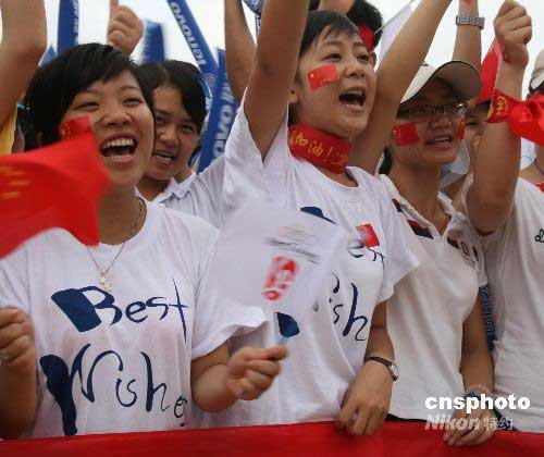 當?shù)孛癖娧赝緹崆闉榛鹁媸帧⒈本⿰W運會加油。中新社發(fā) 林艷華 攝