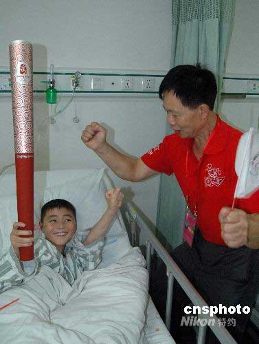 火炬手自發(fā)趕到廣西醫(yī)科大學附屬醫(yī)院,看望在這里治療的四川地震災區(qū)傷員,并讓他們在病床上與“祥云”親密接觸,了卻看奧運圣火傳遞的心愿。中新社發(fā) 蔣雪林 攝