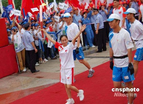 6月8日上午,北京奧運(yùn)火炬在革命老區(qū)廣西百色平果縣進(jìn)行傳遞,第一棒火炬手是平果縣希望小學(xué)校長(zhǎng)、壯族姑娘周標(biāo)亮,她曾受到鄧小平的資助。上世紀(jì)九十年代,鄧小平以“一個(gè)老共產(chǎn)黨員”的名義向希望工程捐款5000元,這筆捐款被落實(shí)到平果縣希望小學(xué),使25名瀕臨失學(xué)的貧困學(xué)生得以繼續(xù)學(xué)業(yè),周標(biāo)亮就是當(dāng)年得到資助的學(xué)生之一。后來(lái),這位壯族姑娘考取了一所師范學(xué)校,畢業(yè)后她回到培養(yǎng)自己的平果縣希望小學(xué)任教,2005年被任命為該校校長(zhǎng)。中新社發(fā) 劉萬(wàn)強(qiáng) 攝