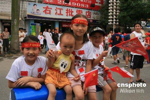 圖為一家姐弟四人手舉五星紅旗迎接奧運圣火。 中新社發(fā) 周兆軍 攝