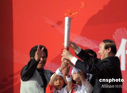 北京奧組委執(zhí)行副主席蔣效愚(右一)幫助地震孤兒擎起祥云火炬。中新社發(fā) 廖攀 攝