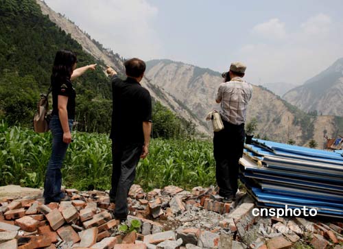 失事直升機(jī)殘骸10日晨在四川汶川映秀鎮(zhèn)3511高地(當(dāng)?shù)卮迕穹Q(chēng)“火燒杠”)被發(fā)現(xiàn),圖為記者遙望四川省軍區(qū)司令員率部趕赴的山頭。中新社發(fā) 賈國(guó)榮 攝