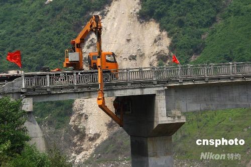 6月10日中午,四川某勘測(cè)設(shè)計(jì)院抓緊時(shí)間,冒著酷暑,在通往映秀鎮(zhèn)的壽江大橋下勘測(cè)橋墩受損情況。中新社發(fā) 譚超 攝
