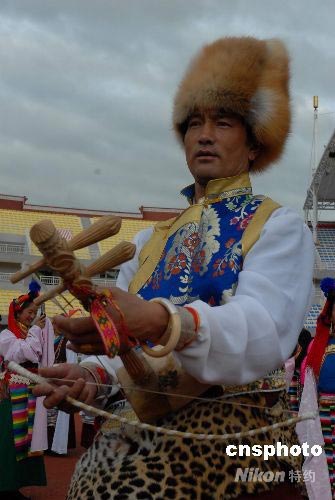 圖為當(dāng)?shù)夭刈迕癖姎g迎圣火來到香格里拉。 中新社發(fā) 石雨 攝