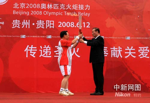 6月12日,北京奧運(yùn)火炬在貴陽(yáng)傳遞,第一棒火炬手、中國(guó)探月工程首席科學(xué)家歐陽(yáng)自遠(yuǎn)從貴州省委書記石宗源手中接過“祥云”火炬。記者周兆軍攝