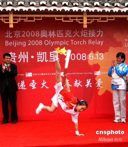 6月13日,奧運火炬在貴州省黔東南苗族侗族自治洲傳遞,第一棒火炬手、體操運動員林麗接過火炬后,做起了精彩的體操動作,引得現(xiàn)場一片喝彩。 中新社發(fā) 周兆軍 攝