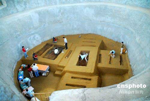 2008年6月15日,安徽省蚌埠市雙墩一號墓發(fā)掘現(xiàn)場。從2006年12月開始,安徽省文物考古研究所展開對雙墩1號墓的發(fā)掘,目前已接近尾聲。據(jù)考古專家論證,春秋時期鐘離國在安徽省蚌埠和鳳陽一帶,今天的“鐘離”和“鐘”姓,一說即來源于該國。鐘離國是春秋時期的一個小國,蚌埠雙墩一號墓位于“鐘離城”遺址不遠,從墓葬規(guī)模和陪葬物品等種種跡象表明,這個奇特的超級大墓,極有可能就是當時鐘離國的國君。目前發(fā)掘工作仍在進行。中新社發(fā) 從啟 攝