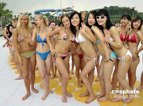 6月15日,充滿了東方魅力的1500名比基尼女郎在廣州長隆水上樂園挑戰(zhàn)2007年在澳大利亞黃金海岸的1010位比基尼女郎合照紀(jì)錄。1500名比基尼女郎齊心協(xié)力通過集體的行為藝術(shù),擺出大型的奧運(yùn)五環(huán)造型,用自己的力量支持北京奧運(yùn)!中新社發(fā) 劉衛(wèi)勇 攝