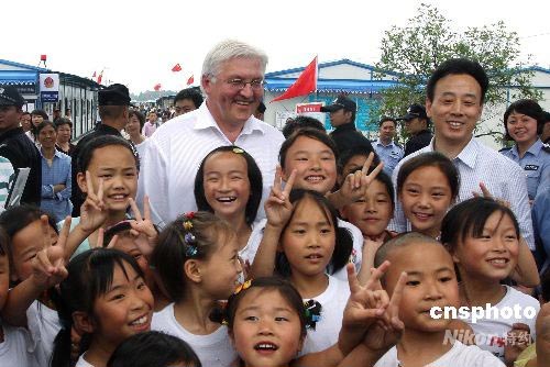 德國(guó)副總理兼外長(zhǎng)施泰因邁爾來(lái)到四川地震災(zāi)區(qū)都江堰市“勤儉人家”安置點(diǎn),看望安置點(diǎn)的居民和帳篷學(xué)校的孩子們。圖為施泰因邁爾和孩子們合影留念。中新社發(fā) 黃榮 攝