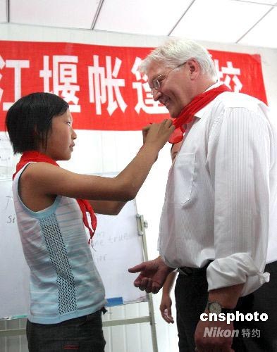 四川地震災(zāi)區(qū)孩子為德國(guó)外長(zhǎng)系上紅領(lǐng)巾