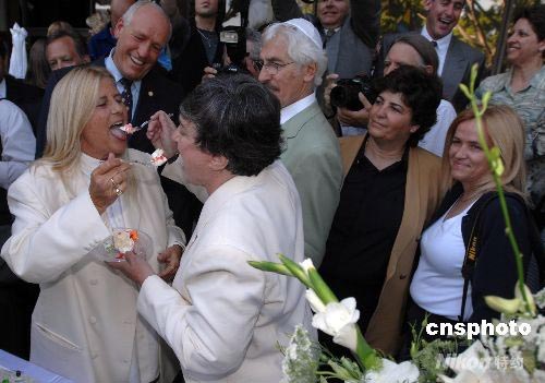 當(dāng)?shù)貢r(shí)間六月十六日下午五時(shí)零一分,美國加州貝弗利山的女同性戀者羅賓·泰勒和戴安·奧爾森(左),在洛杉磯縣政府大樓門前登記結(jié)婚。這是上個(gè)月加州高等法院裁決同性戀婚姻合法化后的洛杉磯縣第一對同性戀結(jié)婚者。當(dāng)?shù)孛襟w蜂擁而至,其中有三家電視臺(tái)同時(shí)進(jìn)行現(xiàn)場直播。中新社發(fā) 張煒 攝