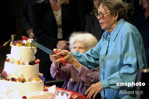 女同性戀者八十七歲的德爾·馬。ㄗ螅┖桶耸臍q的菲莉斯·里昂(右),在相愛五十五年后,終于領取了結婚證書。中新社發(fā) 陳鋼 攝