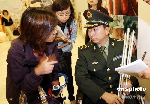 “大愛(ài)無(wú)疆—汶川大地震抗震救災(zāi)圖片展”在香港展覽中心展出,大會(huì)邀請(qǐng)到抗震救災(zāi)第一線的英雄成都軍區(qū)的鐘良軍在開(kāi)幕式上作報(bào)告。中新社發(fā) 洪少葵 攝