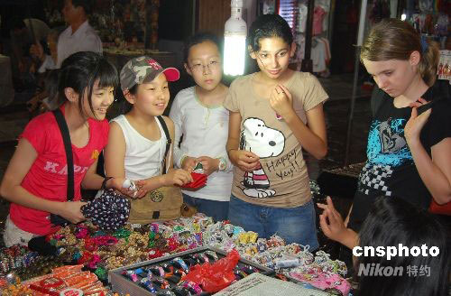 中外小朋友在廣西陽朔西街購物。中新社發(fā) 龍燕秀 攝