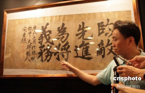 預展中,一幅紙質黃舊的書法作品——“臨敵先進,為將義務”吸引眾人的眼球,這是當年刺殺伊藤博文的韓國民族英雄安重根在獄中的絕筆書。圖為工作人員講解這幅書法作品的歷史價值。中新社發(fā) 趙雋 攝
