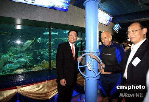 香港特區(qū)商務(wù)及經(jīng)濟(jì)發(fā)展局局長馬時亨(左)、全國水生野生動物保護(hù)分會會長李彥亮(右)、海洋公園主席盛智文在海洋公園海洋館為中華鱘新居揭幕。中新社發(fā) 王麗南 攝