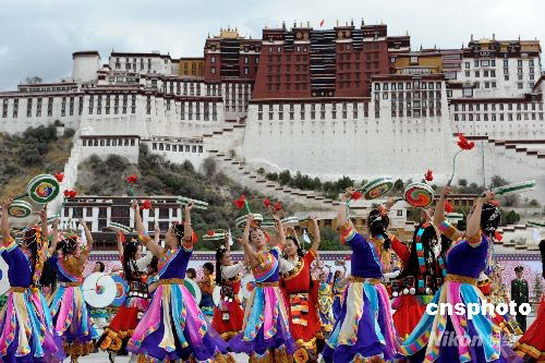 圖:藏族民眾布達(dá)拉宮廣場(chǎng)歡慶奧運(yùn)火炬?zhèn)鬟f