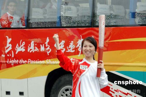 6月21日,奧運(yùn)火炬在西藏拉薩進(jìn)行傳遞,火炬手秦莉手持火炬興奮異常。中新社發(fā) 周波 攝