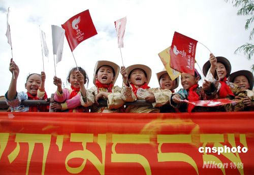 拉薩市的藏族小朋友們穿上節(jié)日盛裝,在街頭歡慶奧運火炬來到雪域高原。中新社發(fā) 周波 攝